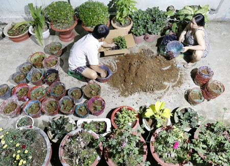 Sau giờ làm việc, cả gia đình ông Sáu Vách (xã Tân Hạnh- Long Hồ) lại cùng trộn phân vô chậu để trồng hoa vạn thọ, hoa cúc. Không khí buổi tối của gia đình ông Sáu cũng vì vậy mà trở nên vui tươi hơn, tiếng nói cười rôm rả. Theo ông Sáu, năm nay là năm thứ hai gia đình ông tự trồng hoa để trang trí nhà cửa trong những ngày tết đến, xuân về. Ông cho rằng, việc cả nhà cùng nhau trồng và chăm sóc hoa sẽ giúp gắn kết thêm tình cảm gia đình, nhất là thời buổi bận rộn “việc ai nấy lo” như hiện nay. Mà hơn hết là “hoa nhà trồng vẫn ý nghĩa hơn là ra chợ mua về, vì đó là công sức của cả gia đình”.