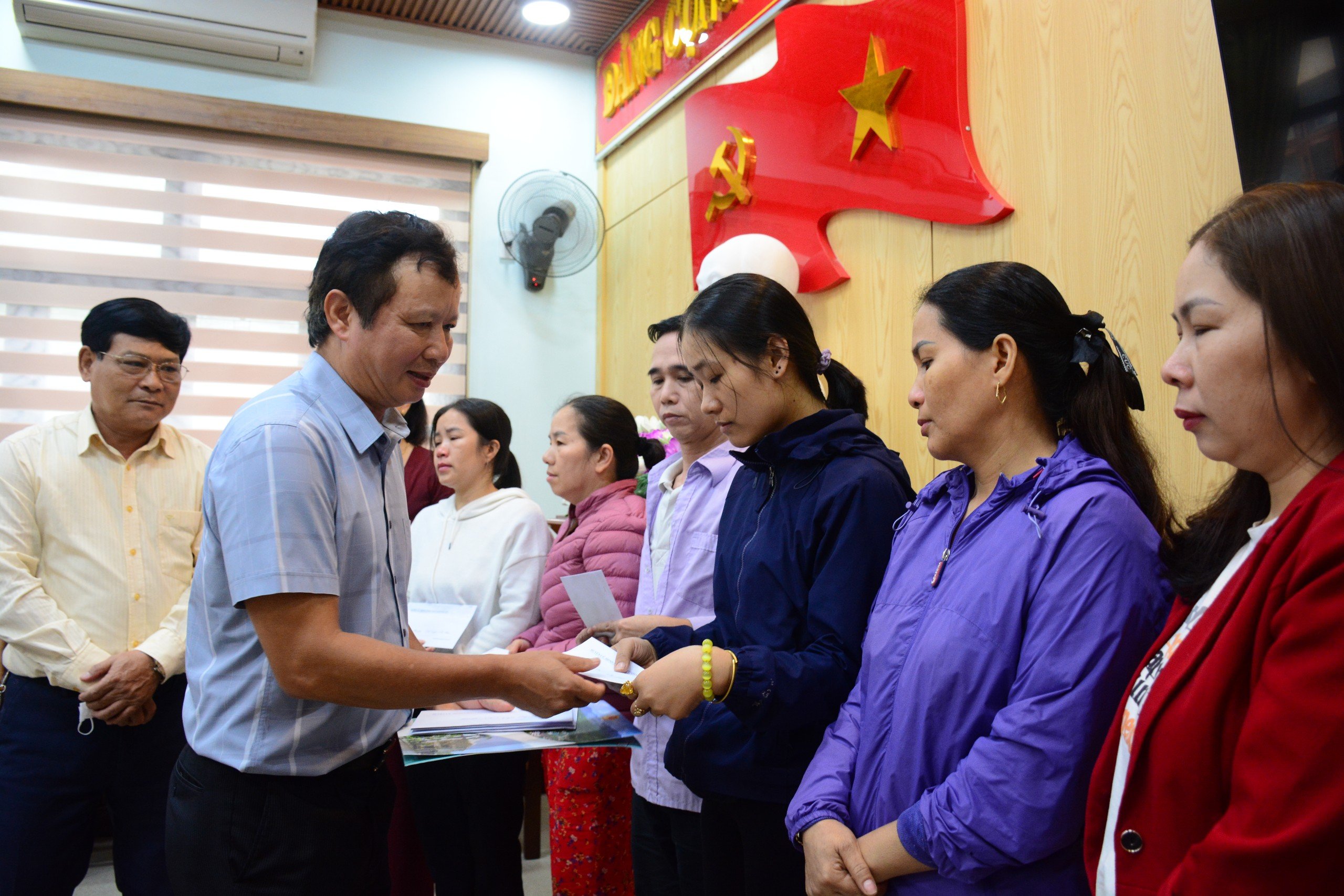 | Bí thư Tỉnh ủy Thừa Thiên Huế Lê Trường Lưu trao quà cho các tiểu thương bị thiệt hại trong vụ cháy |