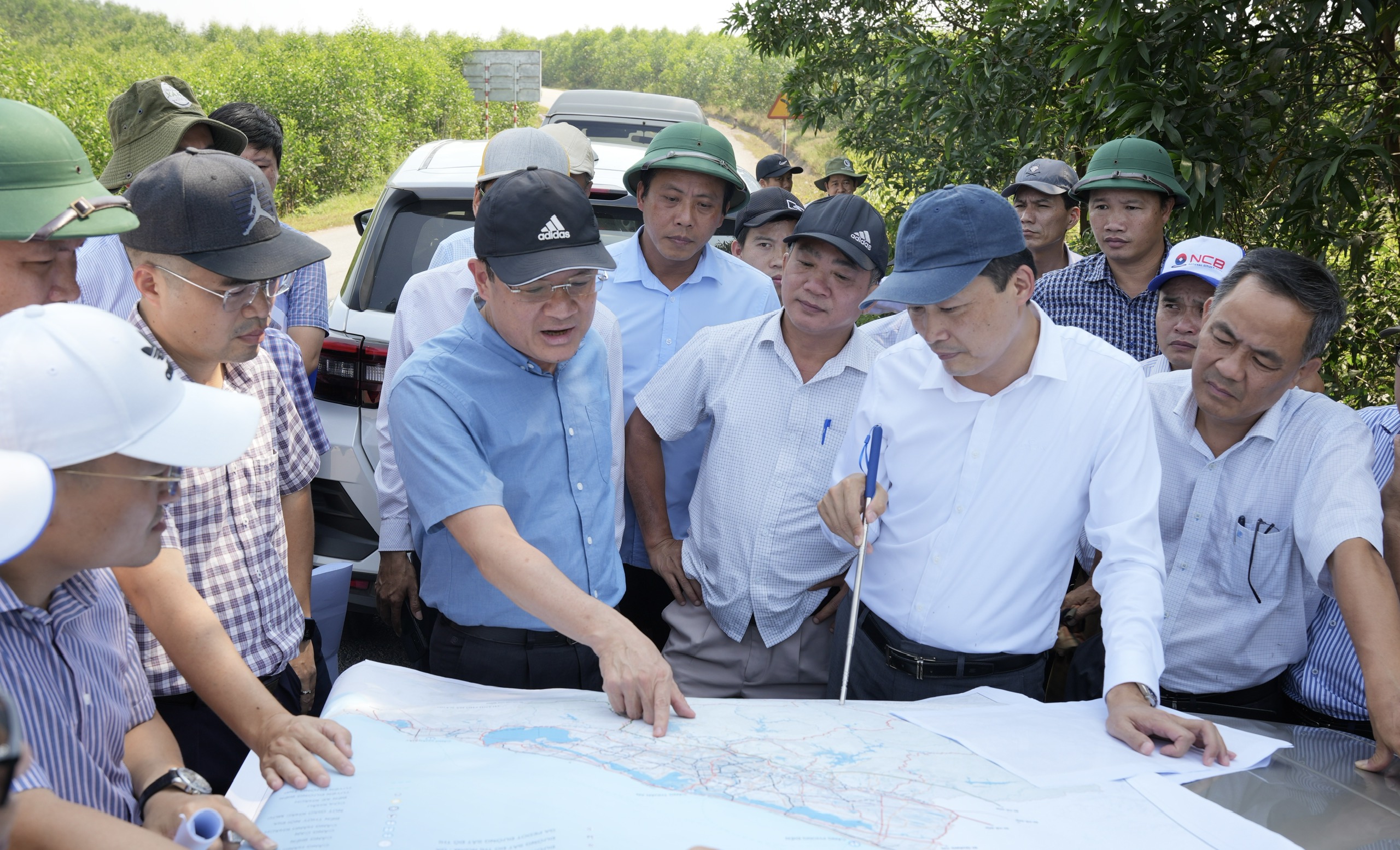 Đoàn công tác đã kiểm tra tại Km 3+500, Tỉnh lộ 14B, xã Lộc Sơn - điểm đầu dự kiến mở rộng để kết nối vào nút giao liên thông với cao tốc; kiểm tra tổng thể quy mô, hướng tuyến mở rộng; đường gom, các nút giao liên thông, các nút bổ sung ở Tỉnh lộ 15; đánh giá nhu cầu và khả năng cung ứng mỏ vật liệu xây dựng, bãi thải; sử dụng đường công vụ phục vụ thi công.