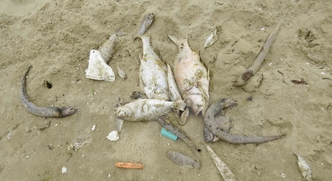 Cá chết dạt vào bờ. (Ảnh: Võ Dung/TTXVN)