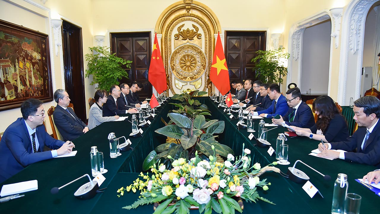 | Thứ trưởng Thường trực Bộ Ngoại giao Nguyễn Minh Vũ hội đàm với Trợ lý Bộ trưởng Bộ Ngoại giao Trung Quốc Nông Dung. |