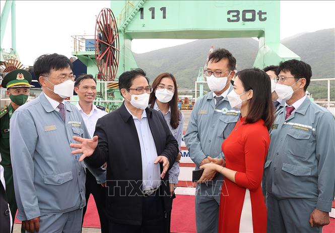 | Thủ tướng Phạm Minh Chính thăm nhà máy đóng tàu Huyndai (Hàn Quốc) tại Khu kinh tế Vân Phong. (Ảnh: Dương Giang - TTXVN) |