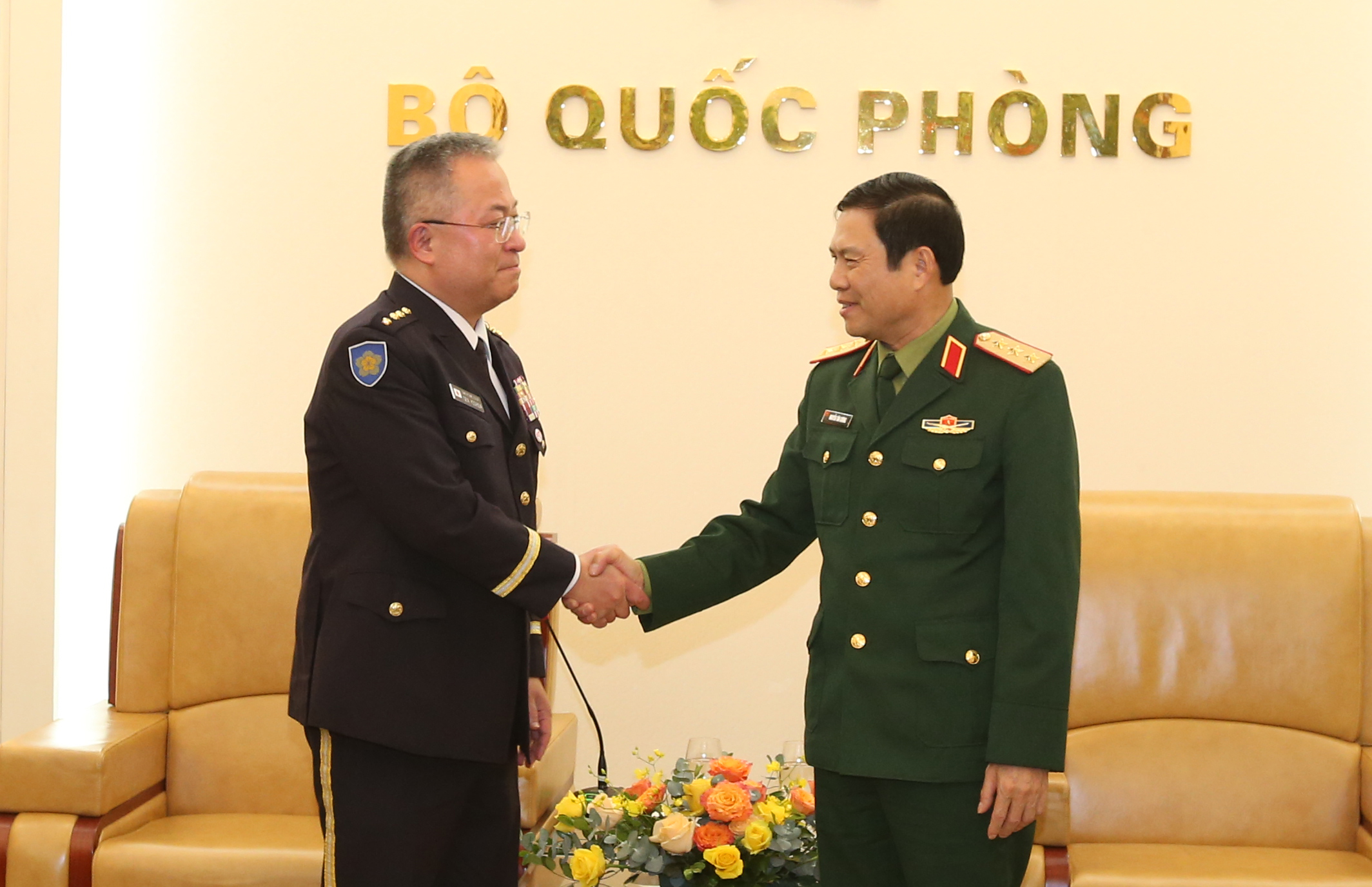 | Thượng tướng Nguyễn Tân Cương và Đại tướng Yoshida Yoshihide tại buổi tiếp |