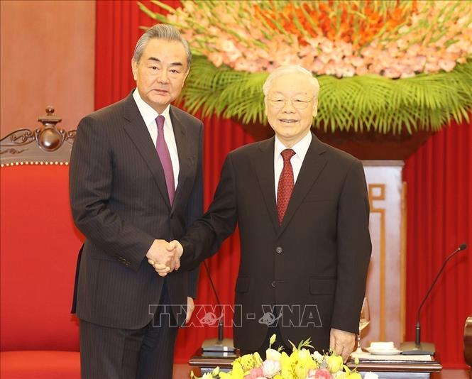 | Tổng Bí thư Nguyễn Phú Trọng tiếp đồng chí Vương Nghị - Ủy viên Bộ Chính trị, Chủ nhiệm Văn phòng Ủy ban Công tác đối ngoại Trung ương Đảng Cộng sản Trung Quốc, Bộ trưởng Bộ Ngoại giao Trung Quốc. (Ảnh: TTXVN) |