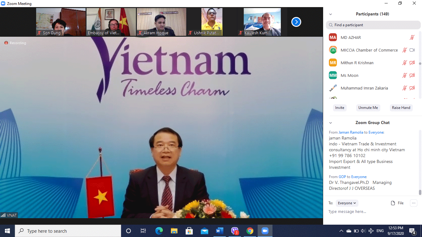Chiều 17/9, Đại sứ quán Việt Nam tại Ấn Độ phối hợp với Công ty Policy Times và phòng Thương mại và Công nghiệp MIICCIA tổ chức Hội thảo trực tuyến “Triển vọng du lịch Việt Nam - Ấn Độ hậu COVID-19”. Hội thảo này nằm trong chuỗi các hội thảo trực tiếp và trực tuyến của “Diễn đàn Doanh nghiệp Việt – Ấn 2020” về các ngành, lĩnh vực nhiều tiềm năng hợp tác song phương nhất như du lịch, đầu tư, xúc tiến thương mại về trái cây, vật liệu xây dựng, dệt may và y tế.
