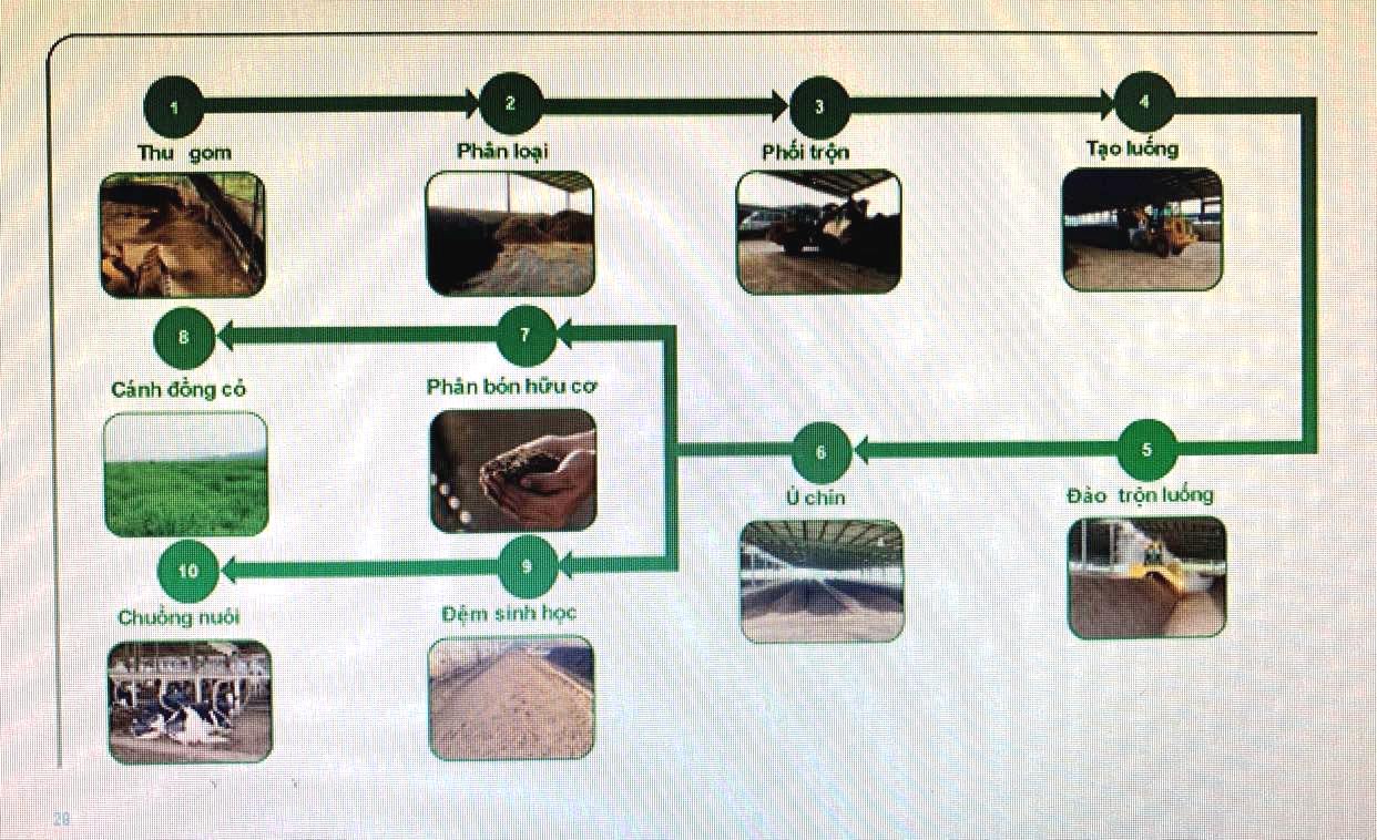 Bên cạnh đó, tại Tập đoàn TH – Doanh nghiệp nổi tiếng trong sản xuất sữa đã và đang áp dụng các quy trình sản xuất tuần hoàn trong chuỗi sản xuất sữa. Cụ thể, trang trại TH áp dụng mô hình tuần hoàn khép kín, toàn bộ vật chất hữu cơ và phế phẩm hữu cơ từ trang trại chăn nuôi được thu gom, xử lý thành chất đệm sinh học phục vụ trang trại và phân bón hữu cơ. Nước thải chăn nuôi được sử dụng để cải tạo đất trồng trọt.