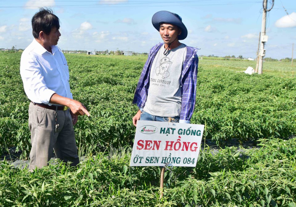 Công chức nông nghiệp - môi trường Huỳnh Tùng Quân (trái) khảo sát rẫy ớt của gia đình nông dân Nguyễn Văn Tân.