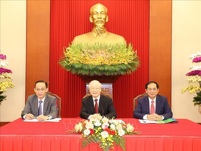 Tổng Bí thư Nguyễn Phú Trọng đã trao đổi với Tổng thống Pháp về những thành tựu to lớn, toàn diện và nổi bật của Việt Nam sau hơn 35 năm Đổi mới cũng như kết quả phục hồi kinh tế hậu đại dịch COVID-19; thông báo với Tổng thống Pháp mục tiêu phát triển của Việt Nam đến giữa thế kỷ XXI và đường lối đối ngoại độc lập, tự chủ, hoà bình, hữu nghị, hợp tác và phát triển, đa phương hoá, đa dạng hoá quan hệ của Việt Nam. Đồng chí Tổng Bí thư nhấn mạnh ý nghĩa quan trọng của hòa bình, hữu nghị và hợp tác cũng như việc tuân thủ các nguyên tắc của luật pháp quốc tế và Hiến chương Liên hợp quốc trong xử lý các vấn đề quốc tế, trong đó có việc bảo đảm hòa bình, an ninh tại khu vực Biển Đông.