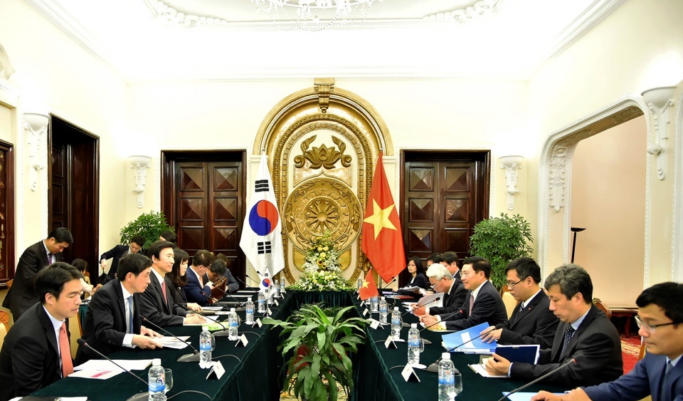 Phó Thủ tướng, Bộ trưởng Ngoại giao Phạm Bình Minh đề nghị phía Hàn Quốc tích cực thúc đẩy và chuẩn bị tốt cho các chuyến thăm, tiếp xúc cấp cao; tăng cường giao lưu, hợp tác giữa các Bộ ngành, địa phương hai nước; thúc đẩy hợp tác kinh tế thương mại phát triển ổn định, cân bằng và bền vững, thực hiện hiệu quả Hiệp định Thương mại tự do Việt Nam – Hàn Quốc, áp dụng các biện pháp hữu hiệu từng bước cân bằng thương mại, giảm nhập siêu của Việt Nam từ Hàn Quốc như: tạo thuận lợi cho việc nhập khẩu các mặt hàng nông lâm thủy sản của Việt Nam vào thị trường Hàn Quốc; tăng cường chia sẻ thông tin hỗ trợ doanh nghiệp xuất khẩu của Việt Nam, hỗ trợ Việt Nam tham gia vào các chuỗi sản xuất cung ứng toàn cầu của Hàn Quốc; khuyến khích doanh nghiệp Hàn Quốc tăng cường đầu tư vào các lĩnh vực phát triển cơ sở hạ tầng, năng lượng tái tạo, công nghiệp phụ trợ, chế biến thực phẩm và nông thủy sản của Việt Nam; tích cực tham gia quá trình tái cơ cấu doanh nghiệp nhà nước, hệ thống ngân hàng của Việt Nam, tiếp tục duy trì cung cấp các khoản viện trợ không hoàn lại và vay ODA cho Việt Nam, sớm trao đổi thống nhất và ký Hiệp định tín dụng khung giai đoạn 2016-2020; tăng cường hợp tác trong các lĩnh vực công nghiệp, nông nghiệp hiện đại, khoa học công nghệ, giao thông, văn hóa, giáo dục, du lịch, giao lưu nhân dân, tăng tần suất các chuyến bay giữa hai nước với sự tham gia của các hãng hàng không của Việt Nam; tiếp tục có những chính sách hữu hiệu tạo điều kiện thuận lợi cho cộng đồng người Việt Nam làm ăn, sinh sống, học tập tại Hàn Quốc.