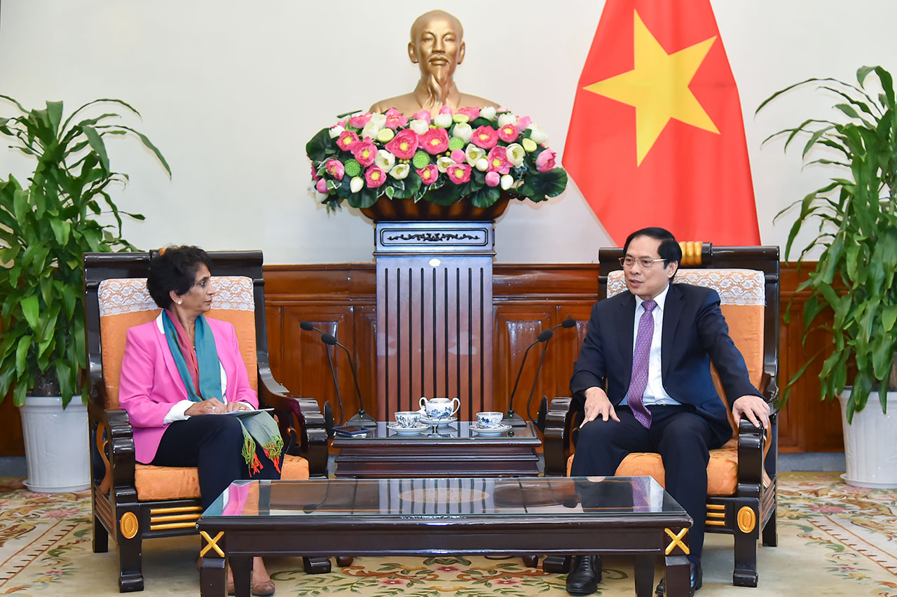 Chiều 28/7/2022 tại Trụ sở Bộ Ngoại giao, Bộ trưởng Ngoại giao Bùi Thanh Sơn đã tiếp bà Kanni Wignaraja, Trợ lý Tổng thư ký Liên hợp quốc (LHQ), Giám đốc khu vực châu Á của Chương trình phát triển LHQ (UNDP) đang thăm, làm việc tại Việt Nam.