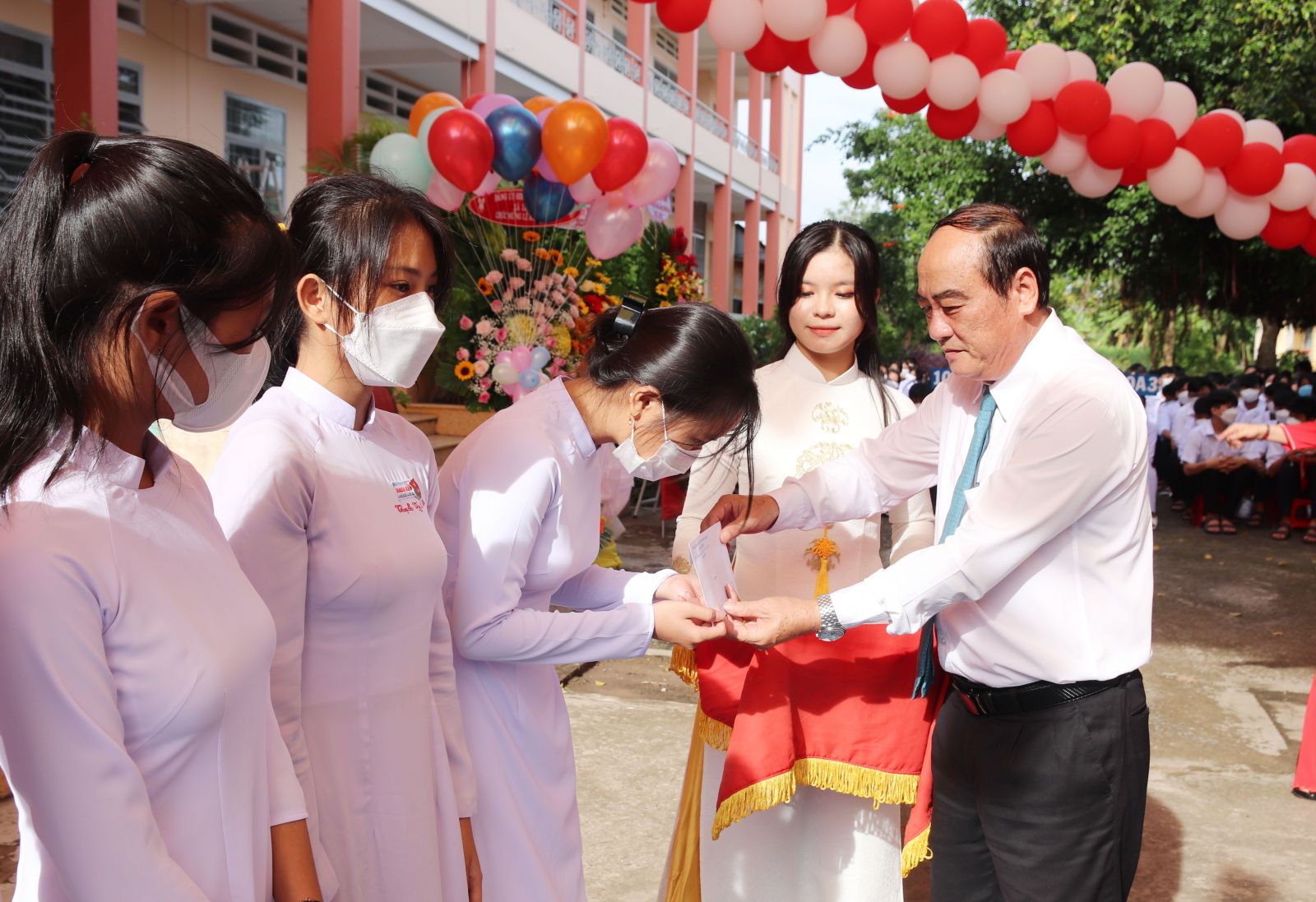 Chủ tịch UBMTTQ Việt Nam tỉnh – Trương Văn Nọ tặng học bổng cho học sinh vượt khó trong học tập tại Trường THPT Rạch Kiến, xã Long Hòa, huyện Cần Đước