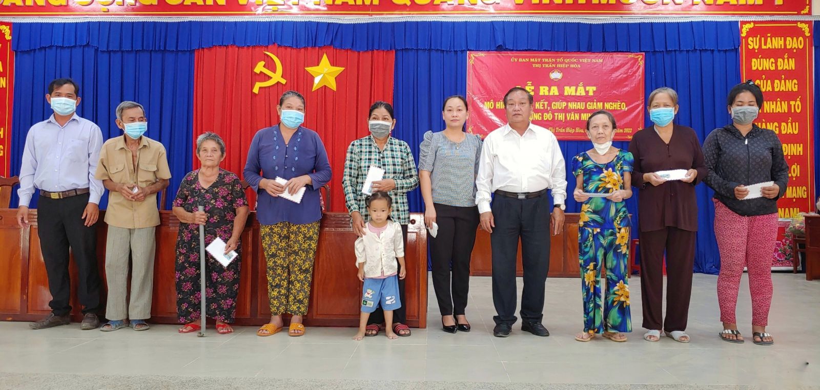 Theo Chủ tịch UBMTTQ Việt Nam thị trấn Hiệp Hòa - Nguyễn Như Ngọc, năm 2022, MTTQ thị trấn thực hiện mô hình “Đoàn kết, giúp nhau giảm nghèo, xây dựng đô thị văn minh”, đã hỗ trợ vốn chăn nuôi và buôn bán nhỏ cho 7 hộ nghèo, cận nghèo, mỗi hộ 3 triệu đồng. Mô hình này ra đời nhằm giúp đỡ các hộ có điều kiện ổn định cuộc sống, phát triển kinh tế, không bắt buộc những hộ được hỗ trợ phải xóa hộ nghèo và cận nghèo vào cuối năm. Để nguồn vốn hỗ trợ phát huy hiệu quả, MTTQ thị trấn còn phối hợp Hội Nông dân Việt Nam, Hội Liên hiệp Phụ nữ Việt Nam, cán bộ khuyến nông thị trấn tập huấn chuyển giao kiến thức trồng trọt, chăn nuôi cho các hộ.