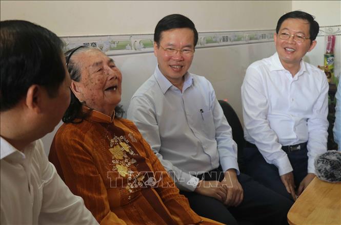 | Đồng chí Võ Văn Thưởng, Ủy viên Bộ Chính trị, Thường trực Ban Bí thư Trung ương Đảng, thăm Mẹ Việt Nam anh hùng Nguyễn Thị Lồng (thành phố Quy Nhơn). Ảnh: Kha Phạm/TTXVN. |