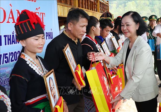 | Thường trực Ban Bí thư Trương Thị Mai tặng quà cho người dân có hoàn cảnh khó khăn tại xã Hua Thanh, huyện Điện Biên. Ảnh: TTXVN. |