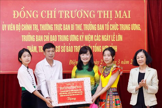 Thường trực Ban Bí thư Trương Mai cùng Đoàn công tác đã đến thăm và tặng quà cho Cơ sở Bảo trợ tổng hợp xã hội tỉnh Điện Biên, nơi đang thực hiện nuôi dưỡng 68 trẻ mồ côi có hoàn cảnh khó khăn không nguồn nuôi dưỡng. Sau khi nghe đại diện lãnh đạo đơn vị báo cáo khái quát tình hình hoạt động, đồng chí Trương Thị Mai đã ân cần thăm hỏi, động viên và trao tặng các suất quà cho trẻ mồ côi tại cơ sở; mong muốn cấp ủy chính quyền địa tỉnh Điện Biên tiếp tục quan tâm, chăm lo, hỗ trợ để các trẻ mồ côi có cuộc sống tốt hơn, bớt đi những thiệt thòi, vươn lên trong cuộc sống. Nhắn gửi tới các học sinh có hoàn cảnh đặc biệt đang được nuôi dưỡng nơi đây, Thường trực Ban Bí thư mong các cháu luôn chăm ngoan, học tập tiến bộ để sau này trở thành công dân có ích, chủ nhân xây dựng quê hương, đất nước…