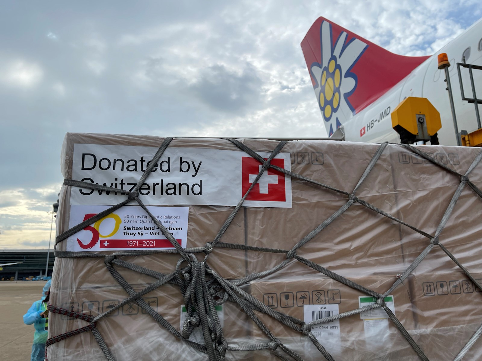 Lô hàng trợ giúp này được chuyến bay đặc biệt của hãng hàng không Thụy Sĩ Eldelweiss vận chuyển từ thành phố Zurich đến thành phố Hồ Chí Minh và được Tổng Lãnh sự Thụy Sĩ Martin Maier trực tiếp trao cho PGS. TS Nguyễn Trường Sơn, Thứ trưởng Bộ Y tế.