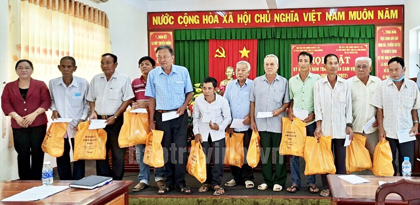 Đồng chí Trần Ngọc Trang (trái), Phó Chủ tịch Hội Bảo trợ Người khuyết tật và Nạn nhân chất độc da cam/dioxin tỉnh Trà Vinh tặng quà cho các đối tượng yếu thế trên địa bàn thị xã Duyên Hải. Ảnh: TL