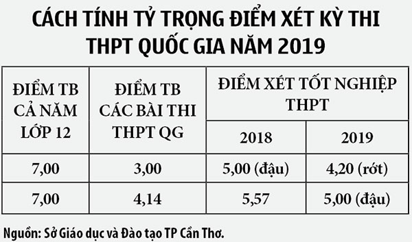 Đối với Trường THPT Trần Đại Nghĩa (quận Cái Răng), những năm qua trường có chủ trương tập trung ôn thi cho học sinh khối 12 chương trình lớp 12 và một số kiến thức trọng tâm, cơ bản của khối lớp 10, 11 nên khi Bộ công bố những điểm mới thì trường không quá bị động. Thầy Trịnh Nguyễn Thi Bằng, Hiệu trưởng Trường THPT Trần Đại Nghĩa, cho biết: “Năm nay, trường có 318 học sinh lớp 12 dự thi, nên ngay sau khai giảng năm học mới, trường đã bắt tay ôn tập cho các em, tránh bị động và nâng cao hiệu quả học tập”. Tuy nhiên, thầy Bằng cũng bày tỏ băn khoăn liên quan đến cách tính điểm xét tốt nghiệp THPT. Năm 2019, điểm xét tốt nghiệp THPT gồm 70% điểm trung bình các bài thi Kỳ thi THPT Quốc gia và 30% điểm trung bình cả năm lớp 12 của thí sinh cộng với điểm ưu tiên, khuyến khích (nếu có). Điều này đồng nghĩa với tỷ trọng điểm bài thi trong tương quan với tỷ trọng điểm trung bình cả năm lớp 12 là 70-30. Trong khi, năm 2018, tỷ trọng này là bằng nhau 50-50. Thầy Bằng phân tích: Với cách tính này, chúng tôi băn khăn liệu điểm nghề của học sinh sẽ cộng vào cụ thể như thế nào, nên Bộ cần quy định rõ hơn.