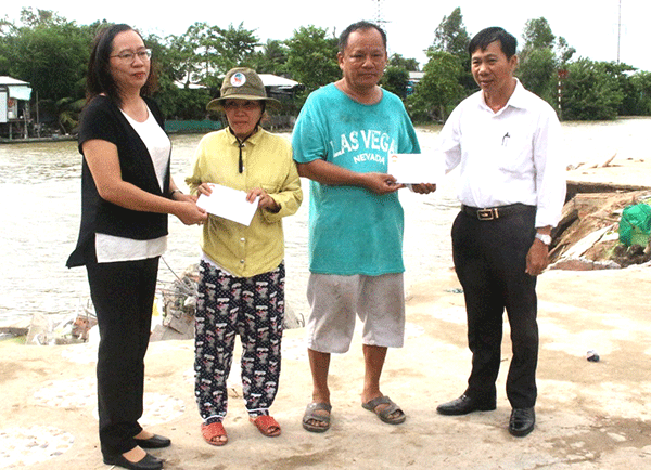 Lãnh đạo UBMTTQVN TP Cần Thơ thăm hỏi, hỗ trợ vật chất các gia đình bị ảnh hưởng sạt lở khắc phục khó khăn. Ảnh: VĂN THỨC