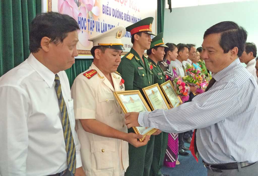 Thượng tá Nguyễn Minh Sáng (thứ 2, trái sang) nhận bằng khen tại Hội nghị biểu dương điển hình tiên tiến trong học tập và làm theo tấm gương đạo đức Hồ Chí Minh
