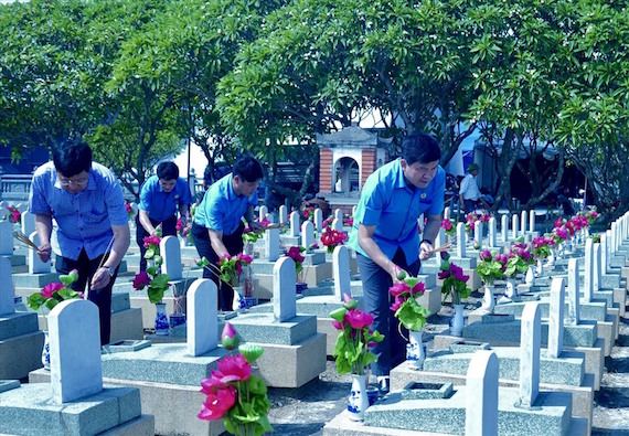 | Cán bộ Công đoàn thắp hương tri ân các anh hùng liệt sĩ tại Nghĩa trang liệt sỹ quốc tế Việt - Lào (huyện Anh Sơn, tỉnh Nghệ An) - Ảnh: Minh Khuê |