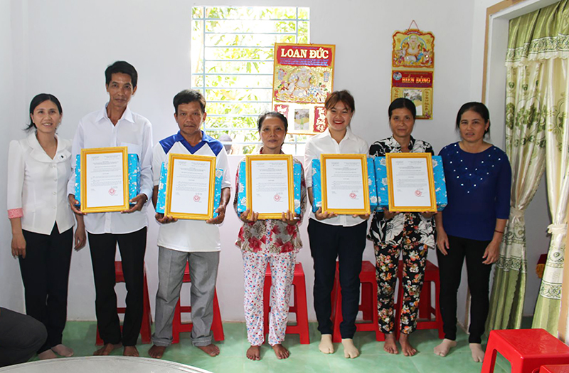 Gia đình chị Nguyễn Thị Thủy và anh Huỳnh Sơn (khu vực Bình Dương) là một trong 5 hộ được nhận nhà. Hơn 20 năm lập gia đình, anh chị vẫn sống trong mái lá tạm bợ, diện tích chưa tới 40m2, dù cả hai vợ chồng đều làm thợ hồ. Đầu năm 2018, con trai đầu lòng của anh chị xuất ngũ trở về địa phương. Thấy gia đình chị Thủy chí thú làm ăn nhưng hoàn cảnh quá khó khăn, địa phương đã xét hỗ trợ cất tặng nhà Đại đoàn kết cho gia đình. Căn nhà xây dựng, hoàn thành trong 1 tháng, do vợ chồng chị Thủy tự xây cất và nhờ thêm 2 người thợ khác phụ giúp. Chị Nguyễn Thị Thủy xúc động nói: “Gia đình tôi vô cùng biết ơn chính quyền, cán bộ mặt trận các cấp, khu vực đã xét hỗ trợ cho gia đình tôi cất được căn nhà khang trang. Gia đình tôi sẽ cố gắng làm lụng để vươn lên. Con trai tôi cũng chuẩn bị học nghề để lo cho tương lai...”. Tương tự, hộ ông Lâm Văn Giảng, ngụ tại khu vực Bình Dương cũng vô cùng khó khăn. Ông Giảng có con trai vừa hoàn thành nghĩa vụ trở về địa phương. Gia đình có 2 công vườn tạp, huê lợi ít ỏi. Căn nhà cũ của gia đình xuống cấp, nhưng không có điều kiện xây mới hay sửa chữa. Được địa phương hỗ trợ 32 triệu đồng, vợ chồng ông góp thêm khoảng 10 triệu đồng để căn nhà thêm khang trang.