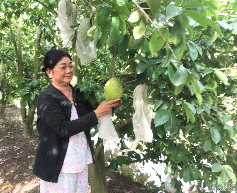 Chèo xuồng đưa chúng tôi tham quan vườn cây trái rộng lớn, chị Nguyễn Thị Mai - vợ anh Tân, phấn khởi khoe vừa cắt bán cho thương lái 2 tấn trái mãng cầu xiêm, với giá “xô” 18.000 đồng/kg. Tuy không được giá như lúc chính vụ nhưng do vườn trái bán quanh năm nên thu lợi nhuận thường xuyên. Từ đầu năm đến nay, chị Mai bán được khoảng 20 tấn trái, giá dao động từ 16.000-35.000 đồng/kg. Nhanh tay vun gốc, chặt bớt các nhánh lá um tùm, chỉnh sửa bao lưới trái mãng cầu đang phát triển tốt, chị Mai bộc bạch: “Từ sáng đến tối, vợ chồng tôi túc trực ngoài vườn để tưới nước, vun phân, bao lưới trái. Ðến vụ thu hoạch, chúng tôi còn tất bật, vất vả hơn nhưng cũng rất phấn khởi với thành quả đạt được”.