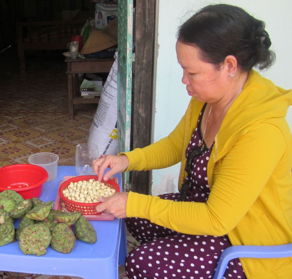 Trời quá trưa, chị Trần Thị Phương và con trai út (đang học lớp 10) vừa hoàn thành bóc vỏ 3,5kg hạt sen thành phẩm trắng sạch, tiền công khoảng 100.000 đồng. Chị Phương cho biết: “Mỗi sáng sớm, tôi đến cơ sở phân phối nhận gương sen về nhà bóc vỏ, tranh thủ làm việc nhà. Lúc đầu, tôi chưa quen việc, làm chậm nên mỗi ngày kiếm được chỉ hơn 10.000 đồng. Sau quen dần, tiền công nhật tăng lên. Hiện việc làm mướn bấp bênh, thu nhập không ổn định, tôi chịu khó giữ công việc này để trang trải chi phí sinh hoạt gia đình”. Lúc trước, khi 3 con trai còn nhỏ, gia đình chị Phương thuộc diện hộ nghèo, vợ chồng chị làm mướn kiếm sống. Năm 2012, chị Phương được xã tặng nhà Đại đoàn kết, Hội Phụ nữ giới thiệu vay vốn ưu đãi 20 triệu đồng để làm ruộng, nuôi heo, trồng dừa. Vài năm sau, 2 con trai lớn của anh chị đi làm công nhân ở Bình Dương, hằng tháng gởi tiền về phụ giúp cha mẹ, nuôi em út học hành. Năm 2014, chị Phương được xét thoát nghèo. Giờ kinh tế gia đình khá ổn định nhưng chị Phương vẫn duy trì việc bóc vỏ hạt sen để đảm bảo việc làm, thu nhập thường xuyên.