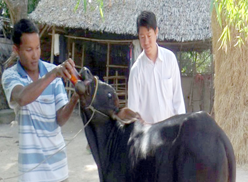 Tiến sĩ Lâm Thái Hùng trực tiếp cùng nông dân “cầm tay chỉ việc” cách chăm sóc bò thịt cho đồng bào Khmer ấp Rọ Say, xã Ngũ Lạc, huyện Duyên Hải. |