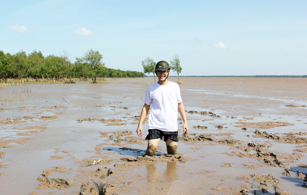 Tiến sĩ Đinh Minh Quang trong chuyến đi thực địa trên bãi bồi. Ảnh do nhân vật cung cấp.