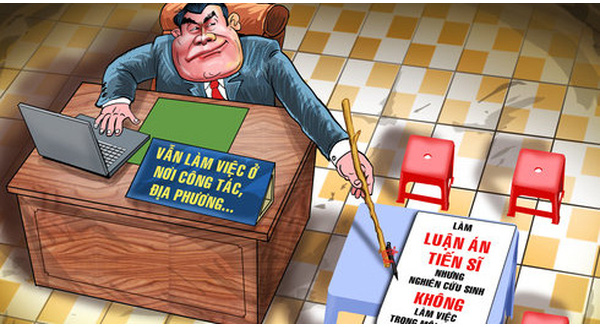 Một số đầu nậu làm dịch vụ luận văn, luận án còn mời tham gia hình thức học tiến sĩ nước ngoài online của một trường đại học “danh tiếng” tại nước nào đó mà chẳng ai biết đến. Theo đó, mỗi khóa học có thời gian 4 năm nhưng để tạo điều kiện cho nghiên cứu sinh, trường ngoại có hình thức học online. Nhiệm vụ của người làm tiến sĩ chỉ là trả tiền, thi thoảng đi du lịch một chuyến, chụp vài tấm ảnh đẹp với mấy bác Tây để về khoe cho thiên hạ biết mình đi học nước ngoài, và cũng đôi khi giao lưu quốc tế với các nhà khoa học hẳn hoi. Một số người con nhà giàu thi trượt đại học đã chọn cách đi học và lấy bằng tiến sĩ ngoại kiểu này, vừa nhàn, vừa… oách.