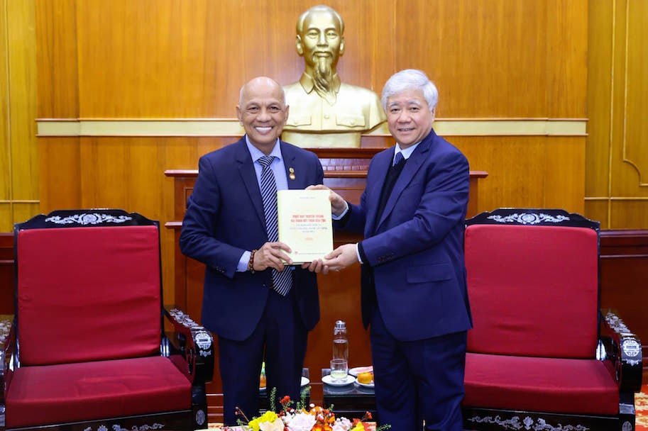 | Chủ tịch Ủy ban Trung ương MTTQ Việt Nam Đỗ Văn Chiến trao tặng cuốn sách của Tổng Bí thư Nguyễn Phú Trọng cho ông Peter Hồng. |