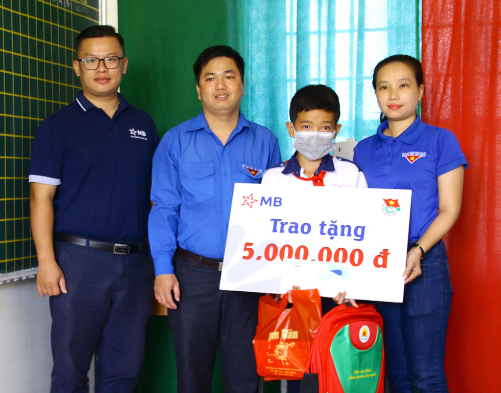Thấu hiểu nỗi lo về các khoản chi tiêu, học tập, Tỉnh đoàn phối hợp Ngân hàng Thương mại Cổ phần Quân đội (MB) - Chi nhánh Long An đến thăm, tặng quà và học bổng nhằm giúp các em giảm một phần khó khăn, tiếp tục đến trường. Được biết, đợt này, MB Chi nhánh Long An tặng 10 suất học bổng cho học sinh mồ côi cha hoặc mẹ do Covid-19 trên địa bàn tỉnh. Mỗi suất học bổng trị giá 5 triệu đồng.