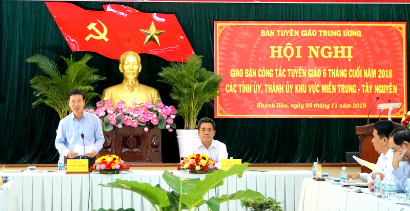 Sáng 29/11, tại TP.Nha Trang (tỉnh Khánh Hòa), Ban Tuyên giáo Trung ương tổ chức Hội nghị giao ban công tác Tuyên giáo 6 tháng cuối năm 2018 cụm miền Trung-Tây Nguyên. Đồng chí Võ Văn Thưởng, Ủy viên Bộ Chính trị, Bí thư Trung ương Đảng, Trưởng Ban Tuyên giáo Trung ương chủ trì Hội nghị.