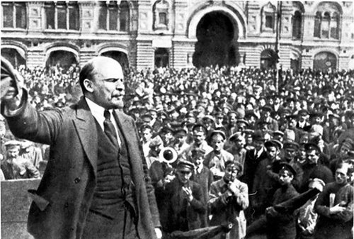 | V.I. Lênin diễn thuyết trước các chiến sĩ cách mạng Hồng vệ binh tại Quảng trường Đỏ Mátxcơva trong Cách mạng tháng Mười Nga. (Ảnh tư liệu) |