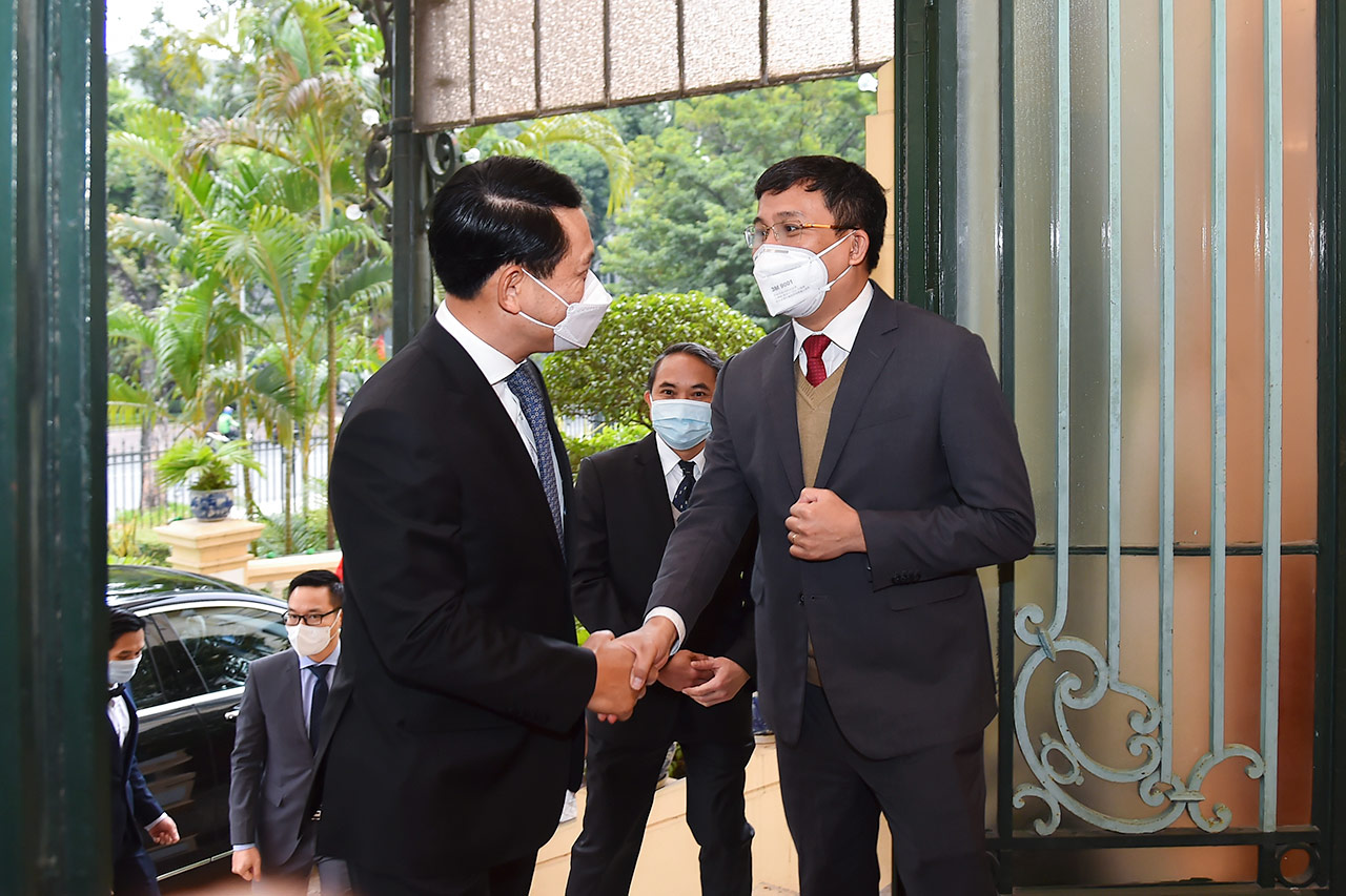 | Thứ trưởng Ngoại giao Nguyễn Minh Vũ đón Bộ trưởng Ngoại giao Lào Saleumxay Kommasith. |