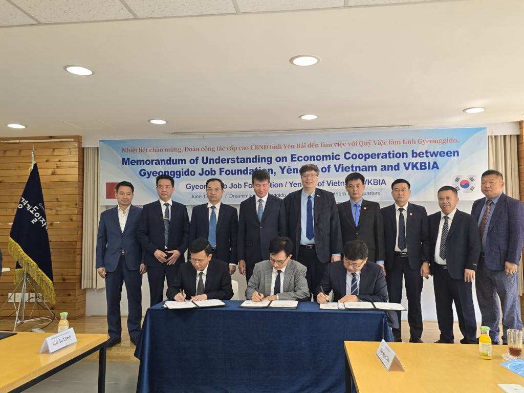 Trong buổi làm việc, dưới sự chứng kiến của Chủ tịch UBND tỉnh Yên Bái Trần Huy Tuấn, ông Trần Hải Linh - Chủ tịch Hiệp hội VKBIA, Lãnh đạo Sở Lao động - Thương binh và Xã hội tỉnh Yên Bái đã ký kết Biên bản ghi nhớ hợp tác với Tổ chức Xúc tiến - Hỗ trợ việc làm tỉnh Gyeonggi-do, Hàn Quốc và Hiệp hội VKBIA; Văn phòng UBND tỉnh đã ký Biên bản ghi nhớ với Cơ quan phát triển Công nghiệp Thành phố Anyang, Hàn Quốc và Hiệp Hội VKBIA.