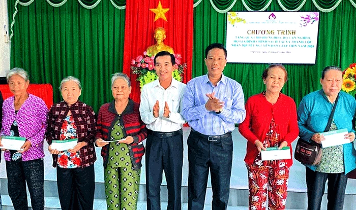 Lãnh đạo UBND thành phố và Chi nhánh NHCSXH tặng quà Tết hộ nghèo, cận nghèo, hoàn cảnh khó khăn ở xã Thạnh Lộc, huyện Vĩnh Thạnh. Ảnh đơn vị cung cấp