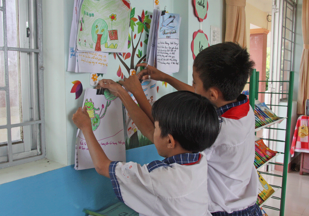 Tùy theo khối lớp, giáo viên giới thiệu đến HS những đầu sách phù hợp. Trong TĐTV, giáo viên tổ chức nhiều hoạt động giúp các em hứng thú học tập, trong đó, HS có thể viết bài cảm nhận và chia sẻ cùng bạn bè về sự hiểu biết của mình sau khi đọc sách hay vẽ các nhân vật trong câu chuyện và trưng bày tại góc trưng bày của phòng học để các bạn cùng xem.