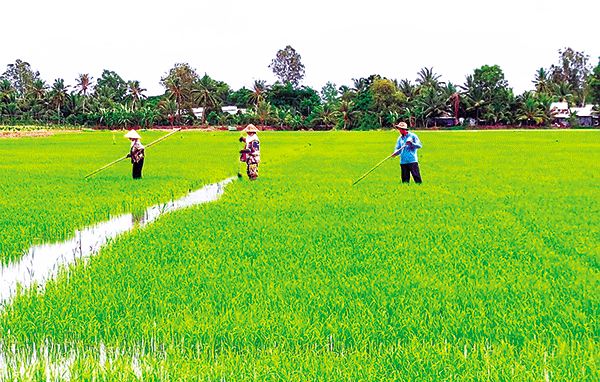 Nông dân ở huyện Thới Lai chăm sóc ruộng lúa vụ thu đông 2021.