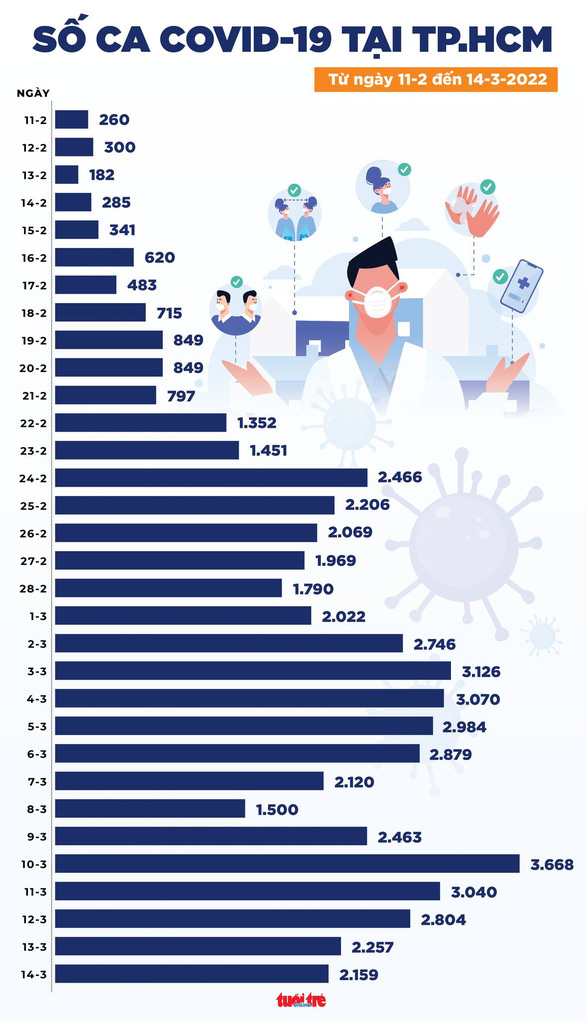 Theo Bộ Y tế, từ 16h ngày 13-3 đến 16h ngày 14-3, trên Hệ thống Quốc gia quản lý ca bệnh COVID-19 ghi nhận 161.262 ca nhiễm mới, trong đó 15 ca nhập cảnh và 161.247 ca ghi nhận trong nước (giảm 5.706 ca so với ngày trước đó) tại 61 tỉnh, thành phố (có 113.084 ca trong cộng đồng).