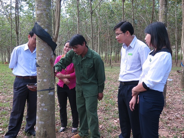 | Cán bộ NHCSXH kiểm tra đồng vốn đầu tư phát triển cao su tiểu điền tại huyện Sa Thầy. |