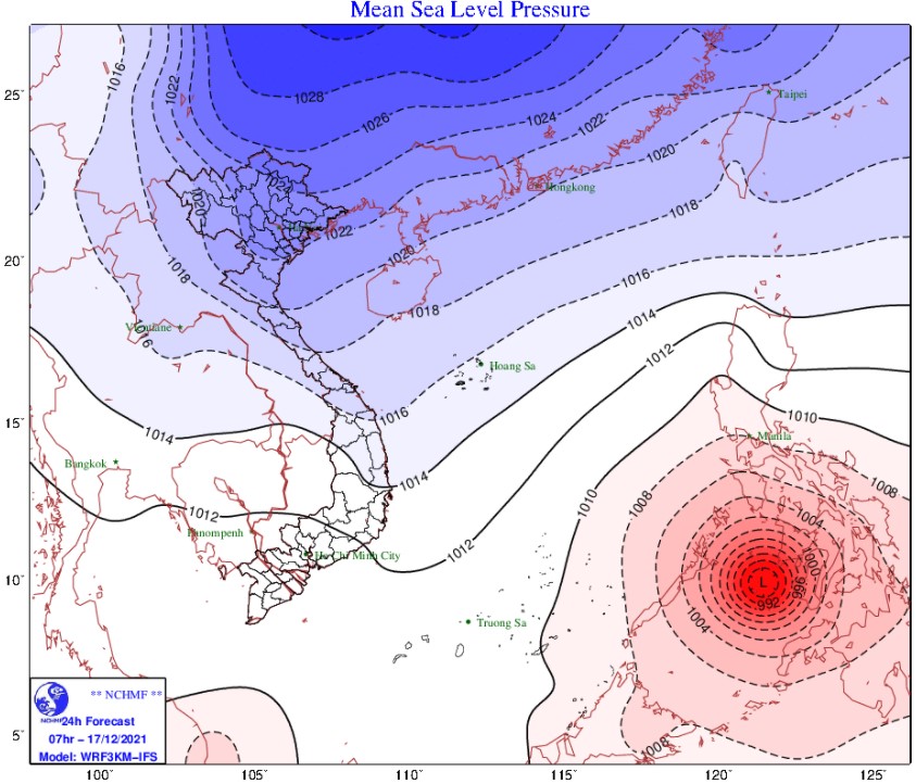 Từ gần sáng nay (17/12), trong đất liền, gió chuyển hướng Đông Bắc cấp 3, vùng ven biển cấp 4; ở vịnh Bắc Bộ, vùng biển từ Quảng Trị đến Cà Mau gió Đông Bắc mạnh dần lên cấp 6, giật cấp 7 -8, biển động, sóng biển cao từ 2,0 - 4,0m; khu vực Bắc Biển Đông (bao gồm cả vùng biển quần đảo Hoàng Sa) gió Đông Bắc mạnh dần lên cấp 7 - 8, giật cấp 10, biển động mạnh, sóng biển cao từ 3,0 - 5,0m.