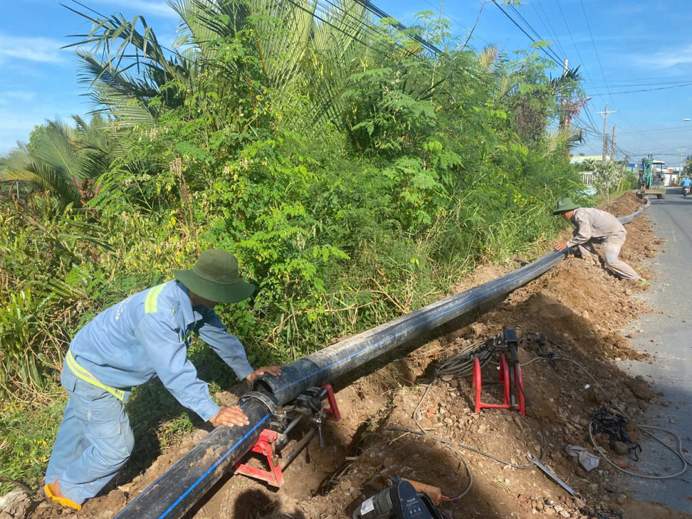 Công ty Cổ phần Nước và Môi trường Cần Đước thi công tuyến ống đưa nước về xã Long Hựu Đông, Long Hựu Tây (huyện Cần Đước)