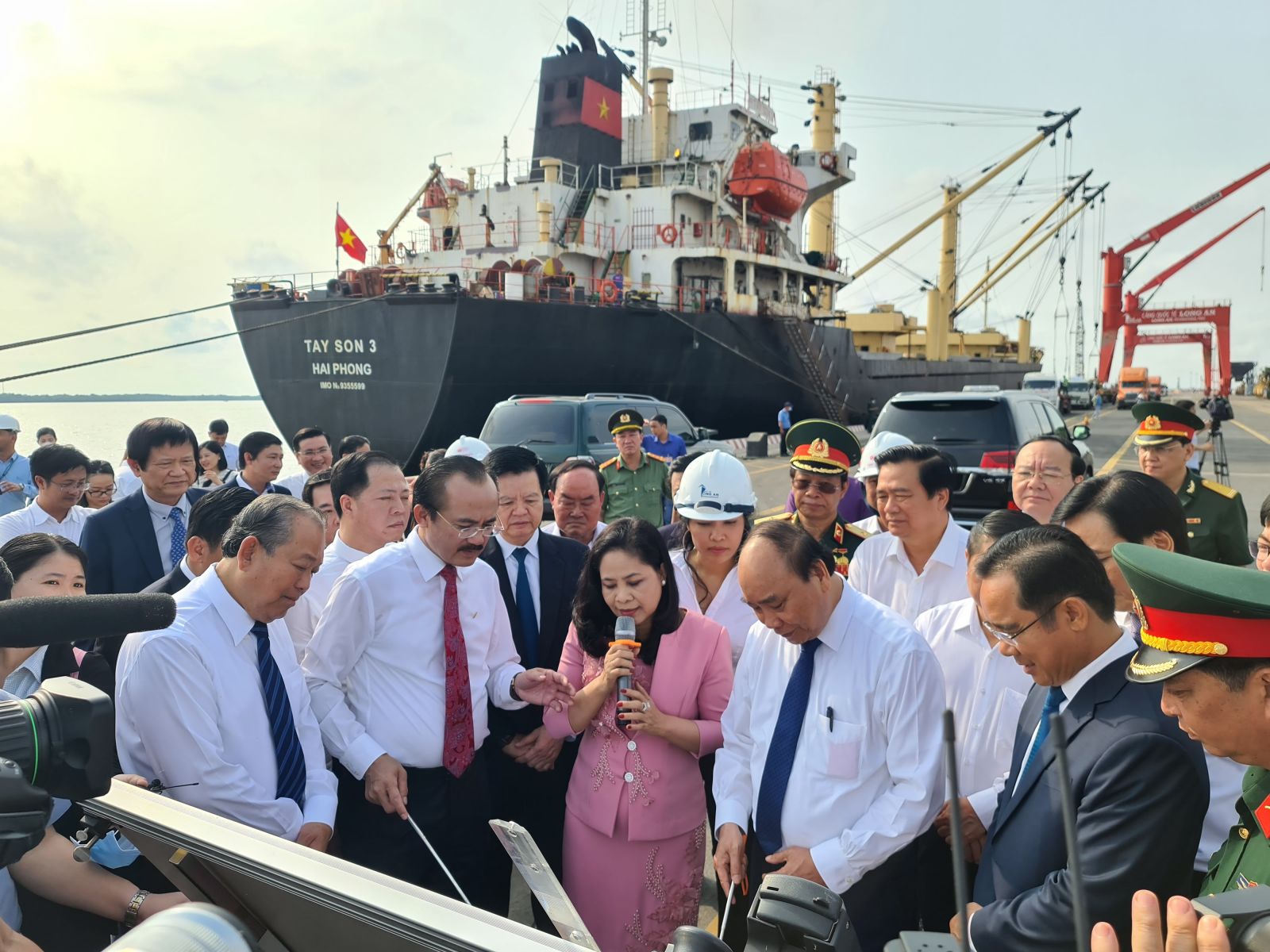 Lãnh đạo Chính phủ, tỉnh thăm Cảng Long An, chứng kiến tàu hàng đang bốc dỡ thép của Công ty Cổ phần Thép TVP lên tàu xuất khẩu. Ảnh: Mai Hương