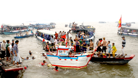 | Nghi thức hạ thủy bè thủy lục tại Lễ Tống ôn ở Miếu bà Xóm Chài (Cái Răng- Cần Thơ). Ảnh: DUY KHÔI |
