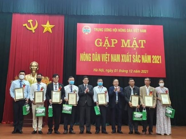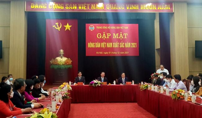 Chiều 1/12, tại trụ sở ở Hà Nội, Trung ương Hội Nông dân Việt Nam đã tổ chức buổi gặp mặt thân mật 63 gương mặt nông dân xuất sắc 2021 (9 đại biểu của 9 tỉnh thành cũng không về tham dự trực tiếp do dịch bệnh phức tạp) cùng 10 danh hiệu nông dân chuyển đổi số (2 trong số 10 đại diện không về dự được do dịch bệnh).