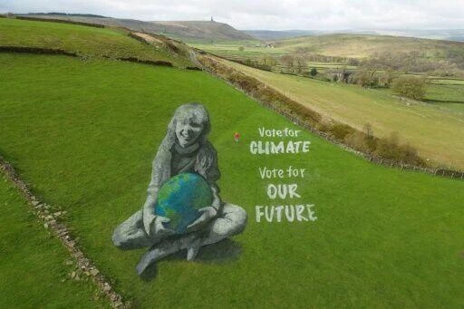 Nghệ sĩ Jamie Wardley cùng 10 họa sĩ khác đã sử dụng sơn sân thể thao và bình xịt để tạo ra tác phẩm nghệ thuật đặc biệt này trong vòng 3 ngày. Tác phẩm dài 50 mét, phác họa hình ảnh một bé gái đang tươi cười dang hai tay ôm Trái đất vào lòng. Bên cạnh em là dòng chữ: "Bỏ phiếu cho khí hậu, bỏ phiếu cho tương lai của chúng ta".