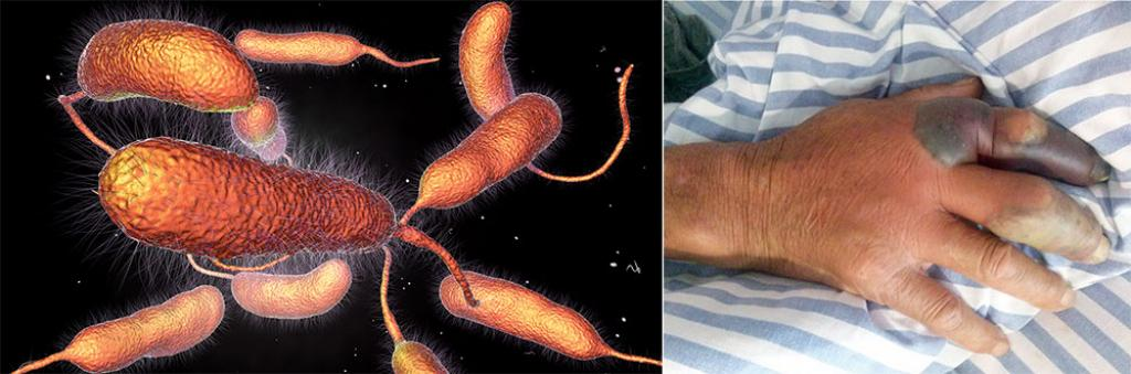 Vi khuẩn Vibrio vulnificus (trái) và bàn tay bị hoại tử của một bệnh nhân.