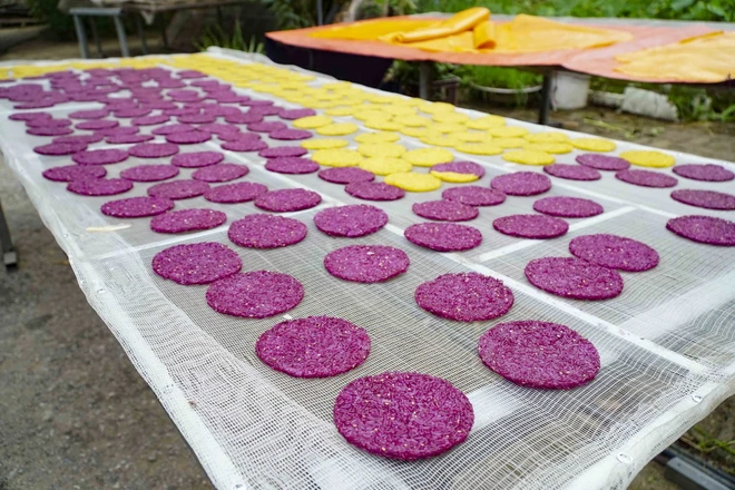 Những chiếc bánh khẩu chí chọp nhiều màu sắc được phơi đến khi giòn. (Ảnh: Xuân Tư/TTXVN)